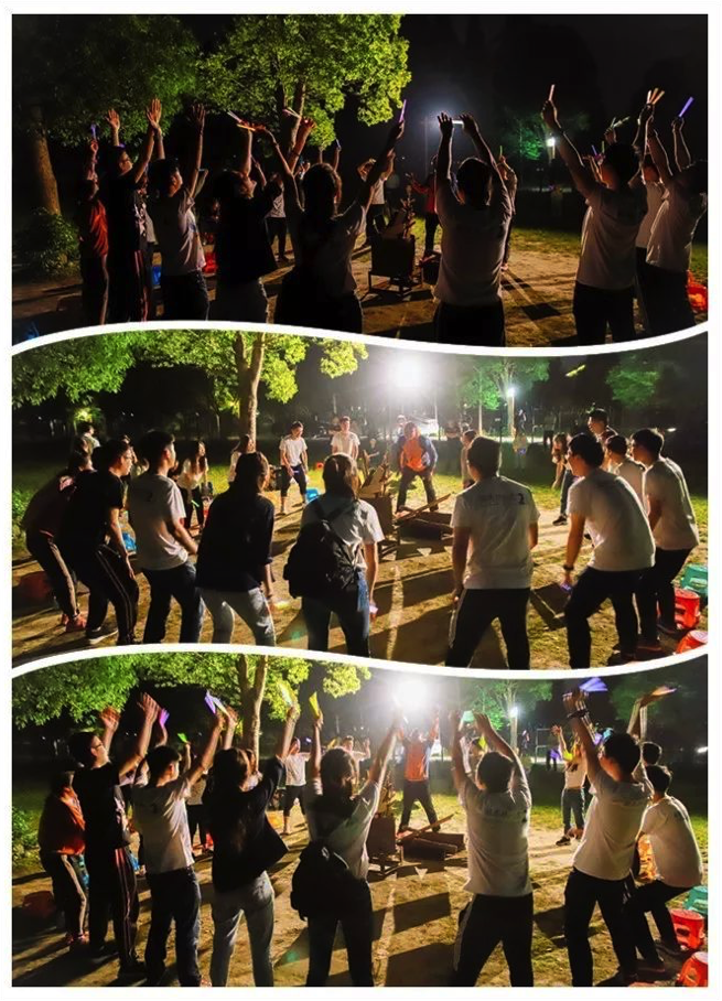 不知不觉间,夜幕已经降临,一盆等待点燃的篝火在场地间静静伫立,等待着同学们的降临。同学们在教练的带领下,举行了古朴的“原始人”求火仪式,而熊熊的篝火在同学们兴奋和期待的目光中,缓缓燃烧起来,点亮了梅花洲那一片星空。